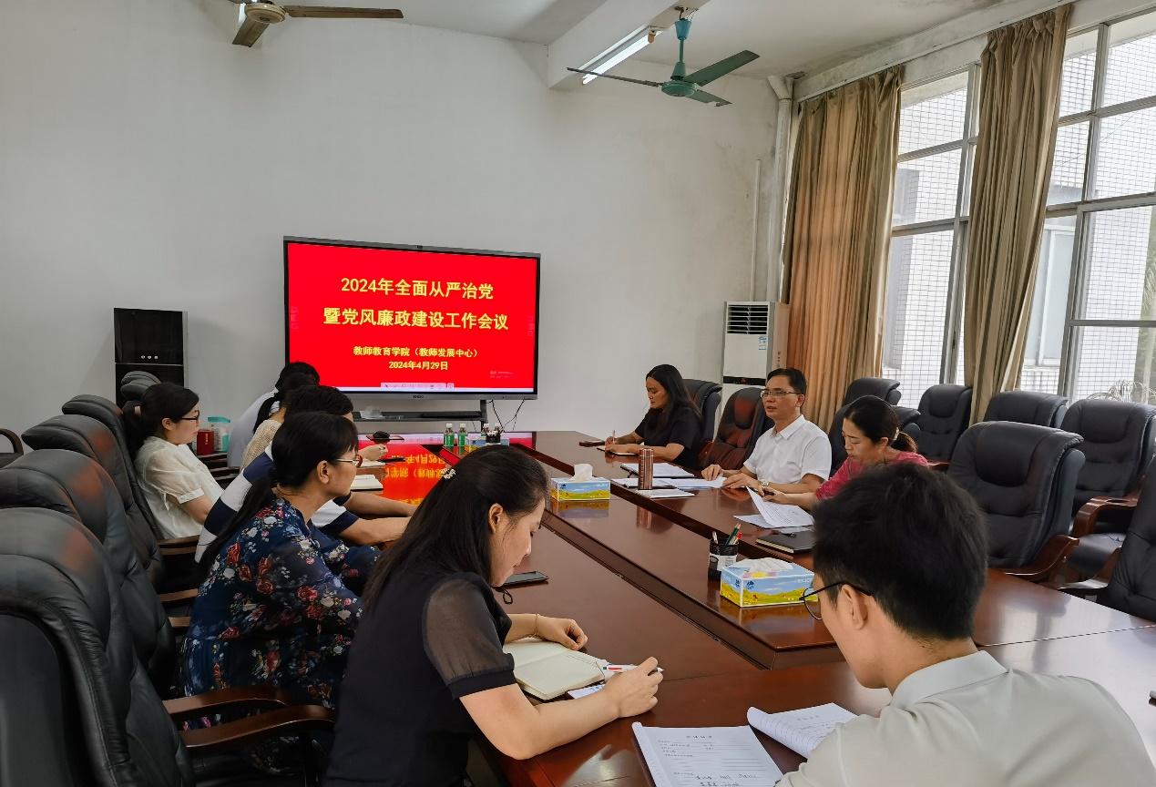 4月29日,william威廉英国官网(教师发展中心)党总支在209会议室召开全面从严治党暨党风廉政建设工作会议。党总支书记植可焕主持会议。经理(主任)杨琰及班子成员、党政办主任、组织员、各党支部书记以及全体党员参加会议。