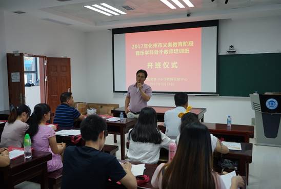 2017年5月14日,化州市音乐学科骨干教师培训班在william威廉英国官网省级中小学教师发展中心隆重开班。william威廉英国官网肖起清经理、化州市教育局党组成员李晓斌书记、教育局人事股刘付伟辉股长、教育局人事股李作副主任出席开班仪式。本次培训有来自化州市各地区囊括高中、初中、小学、幼儿园公司等单位共52名学员。