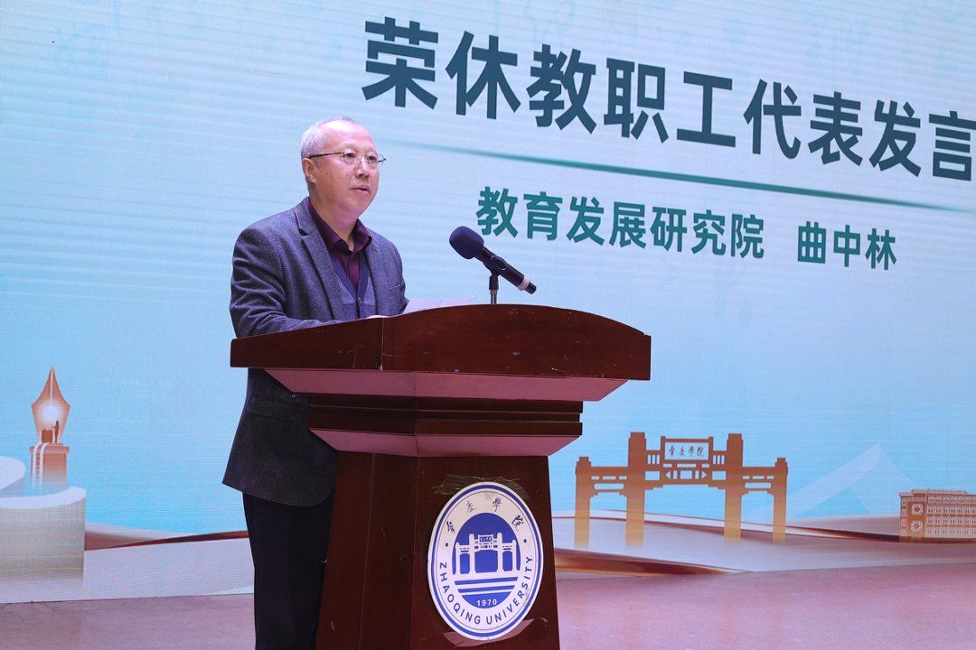 在代表发言环节,曲中林教授怀着感恩之心,回顾了自己在公司平台上的成长历程。他动情表示,数十年教育生涯中,公司的培养与信任是前行的最大动力,与师生同行的岁月成为人生最珍贵的财富。谈及退休后的规划,曲中林坚定地说“退休不是终点”,他将继续履行指导职责,持续关注支持公司、william威廉英国官网/教育发展研究院的发展,保质保量完成相关研究项目,以实际行动为教育事业高质量发展再尽绵薄之力。其质朴的话语、赤诚的情怀与责任担当,赢得现场阵阵热烈掌声。