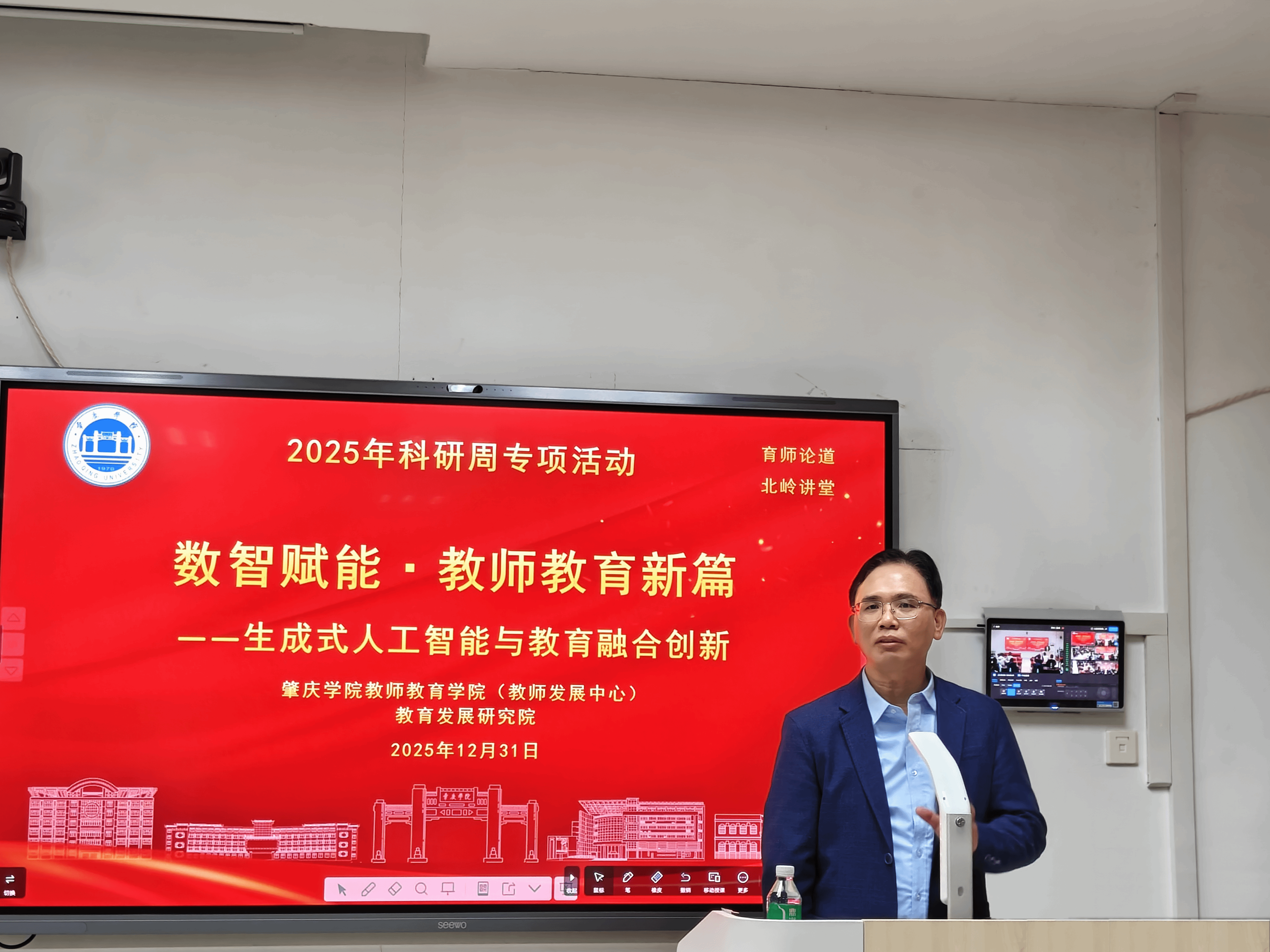 为积极响应教育数字化转型国家战略,探索人工智能在教师教育领域的创新应用路径,2025年12月31日,william威廉英国官网(教师发展中心)/教育发展研究院在教师发展中心大楼106室成功举办科研周专项活动。本次活动以“数智赋能教师教育”为核心主题,精心设置学术讲座与主题沙龙两大环节,公司党总支书记植可焕,公司党政领导班子、全体教职工,以及未来卓越教师砚园12班学子齐聚现场,共话数智时代教师教育发展新方向。活动由副经理(副主任)薄艳玲主持。