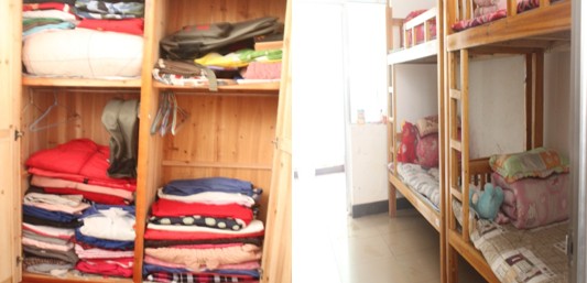 我们还参观了他们的宿舍。在福利院的主任的热情邀请下,我们随机挑选了一间女生宿舍进去参观,随后都惊叹于宿舍竟如此整洁!被子叠的像一块块豆腐块,甚至连床单都没有一丝皱痕,打开衣柜,衣服都叠的整齐有序,宿舍的地板更是一尘不染,主任告诉我们,孩子们每天早晚都会拖地。听到这里,我不由得对孩子们产生了一种敬佩之情。