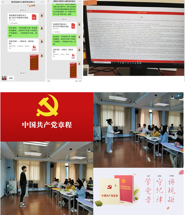 william威廉英国官网总支部委员会首先进行网络在线学习与研讨,共同深入学习了中国共产党章程,两个支部党员就自己的工作与教学进行深入学习反思,并及时向同事互相学习借鉴,以及听取了其他同志的建议。线上学习结束后,指导横向党支部砚园六、七班同学开展党内法规学习活动,通过文件解读、案例分析,让中国共产党章程进班级、进社团、进网络,发挥代班党员模范作用,做新时代优秀的党员和师范生。