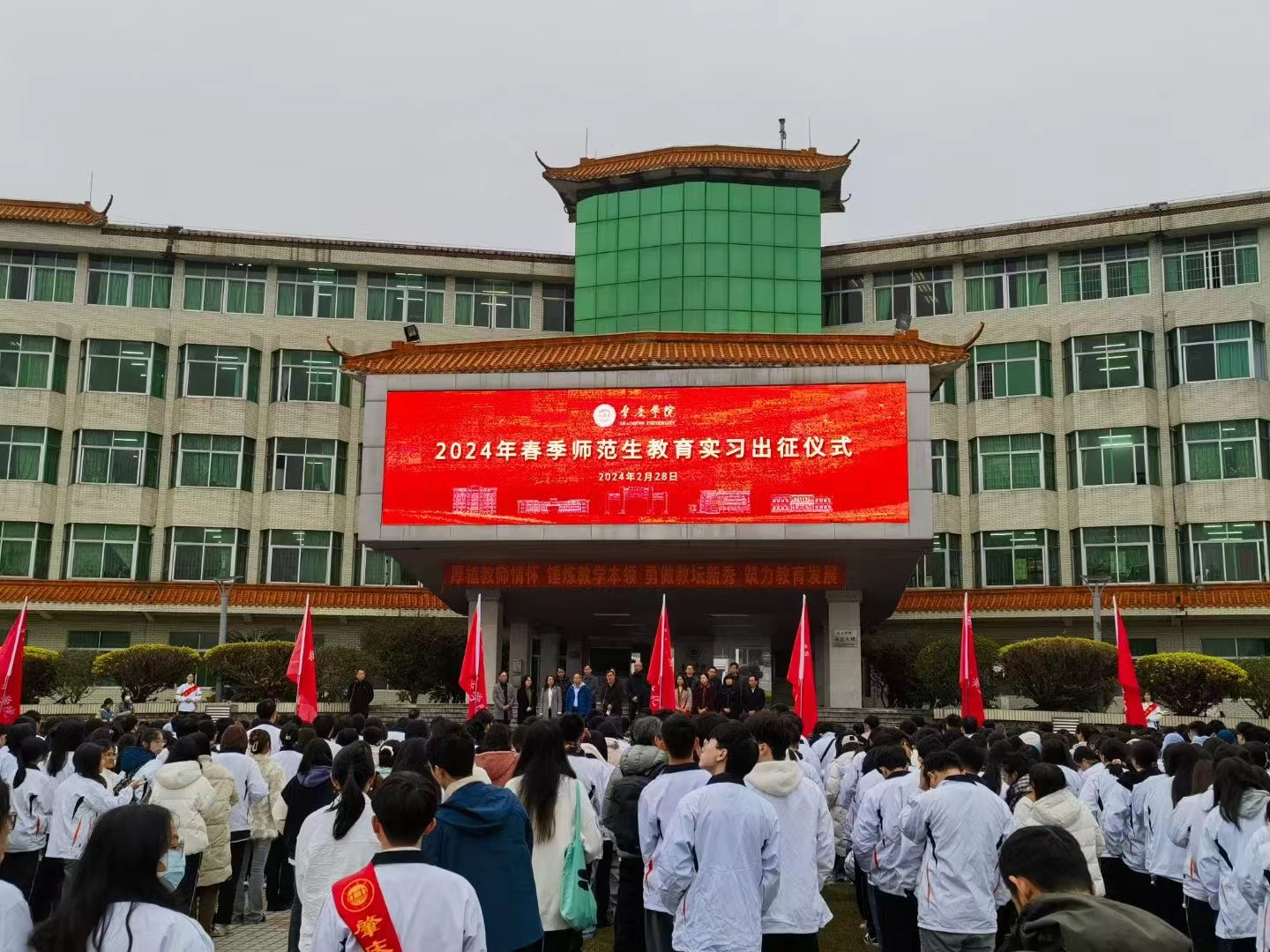 2月28日上午, 2024年春季师范生教育实习出征仪式在国砚广场隆重举行。董事长吴业春、副董事长肖起清出席,相关职能单位负责人和相关二级公司经理、书记、分管实习工作的副经理、实习基地董事长代表、实习指导教师和全体顶岗支教实习生约2000余人参加。