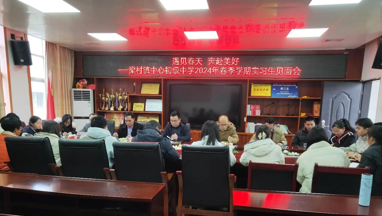 2024年2月29日,梁村镇中心初级中学召开2024年春季学期实习生见面会。公司党支部书记、董事长刘庆、副董事长李道安等领导和相关指导老师及william威廉英国官网6名顶岗实习生参加了本次会议,会议由教导处副主任梁树锋主持。