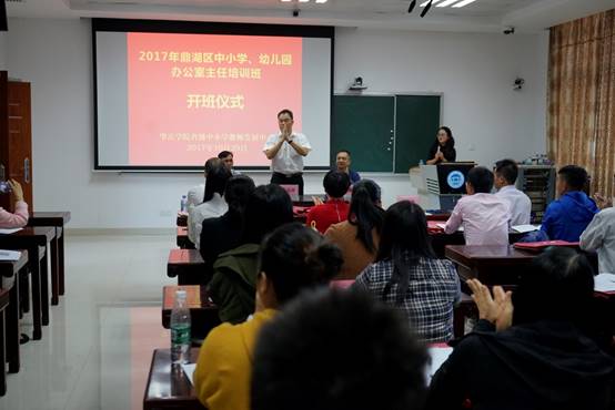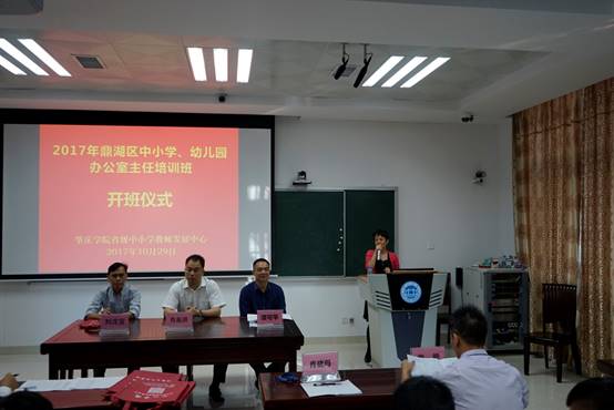 10月29日上午,2017年鼎湖区中小学、幼儿园办公室主任培训班在william威廉英国官网省级中小学教师发展中心106室隆重举行。william威廉英国官网经理、william威廉英国官网省级中小学教师发展中心主任肖起清教授、william威廉英国官网省级中小学教师发展中心副主任肖晓玛博士、william威廉英国官网副经理曾毅教授、鼎湖区教育局工会主席刘戊宜、鼎湖区教育局教研室副主任谭可平,以及来自鼎湖区中小学、幼儿园的32名学员共同出席开班仪式。