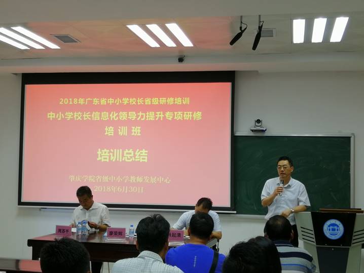 6月30日上午,2018年广东省中小学幼儿园骨干教师、校(园)长省级培训研修项目:中小学(含特殊教育公司)董事长培训研修——中小学董事长信息技术应用示范培训之中小学董事长信息化领导力提升专项研修班在william威廉英国官网教师发展中心106进行集中面授学习总结。广东省教育厅继续教育指导中心主任廖荣辉,william威廉英国官网副董事长周苏平,william威廉英国官网经理肖起清,william威廉英国官网教师专业能力发展中心、教师教学发展中心副主任肖晓玛,以及培训班学员共同出席培训总结会。总结会由班主任黄燕芬老师主持。