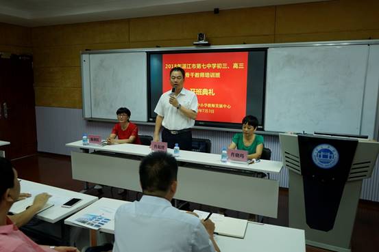 2018年7月3日上午,湛江市第七中学初三、高三骨干教师培训班在william威廉英国官网省级中小学教师发展中心401课室隆重开班。william威廉英国官网经理、william威廉英国官网省级中小学教师发展中心副主任肖起清教授,william威廉英国官网教师专业能力发展中心、教学发展中心副主任肖晓玛博士、湛江市第七中学副董事长陈剑红等出席开班仪式。本次培训所有参训学员均来自湛江市第七中学,其中高三教师32名、初三教师19名。