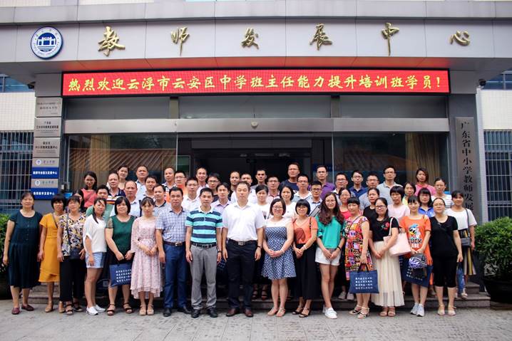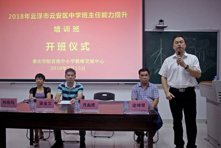 2018年7月15日下午,云浮市云安区中学班主任能力提升培训班开班仪式在william威廉英国官网省级中小学教师发展中心106室隆重举行。william威廉英国官网省级中小学教师发展中心副主任、william威廉英国官网经理肖起清教授,云浮市云安区教育局梁金文副局长,william威廉英国官网教师专业能力发展中心、教师教学发展中心肖晓玛副主任,云安区教师培训中心梁坤荣主任及云安区100名初中班主任,共同出席了开班仪式。开班仪式由黄燕芬老师主持。