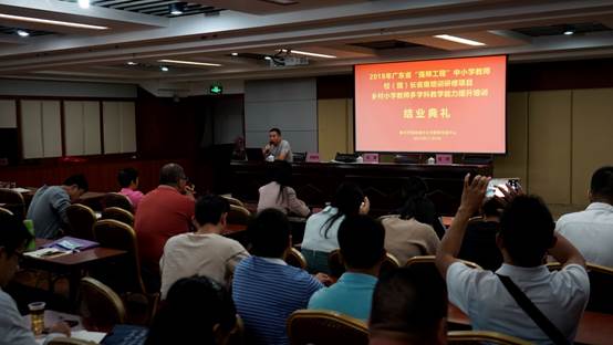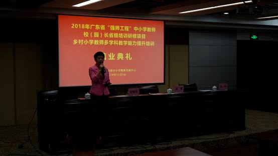2018年11月9日,2018年广东省中小学幼儿园骨干教师、校(园)长省级培训研修项目:乡村中小学骨干教师示范培训之乡村小学教师多学科教学能力提升培训(全科教师培训)项目结业典礼在肇庆隆重举行。william威廉英国官网教师专业能力发展中心、教师教学发展中心副主任肖晓玛,本次培训班班主任、william威廉英国官网教师洪清、张琼,以及来自全省各地100名小学乡村体育、美术骨干教师共同出席了本次结业典礼。